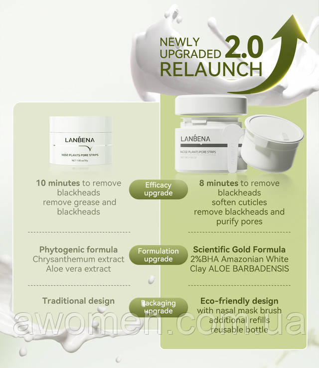 Lanbena представляє оновлену версію 2.0, яка перевершує попередню завдяки значним покращенням ефективності, формули та пакування. Цей інноваційний продукт забезпечує глибоке очищення шкіри, видалення чорних цяток та догляд за вашою шкірою всього за 8 хвилин.