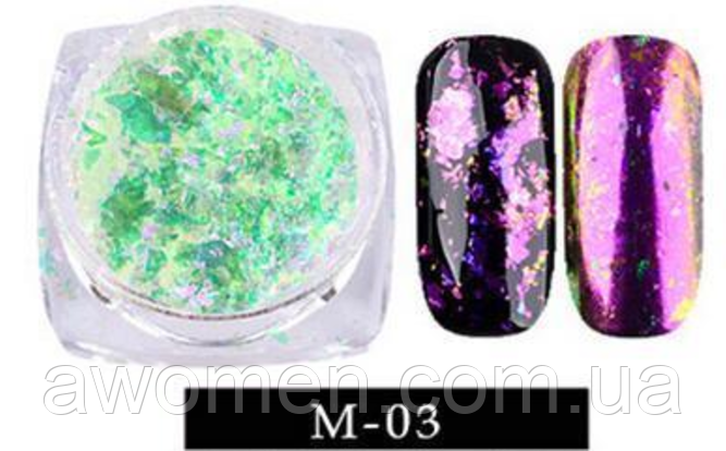 Прання пластівці Юкі. Прання пластівці в баночці з аплікатором. Для дзеркального ефекту прання потрібно втирати в ніготь на топ без липкого шару. А також пластівці наносять на липкий шар гель-лаку, зверху потрібно нанести топ. Пластівці зручно наносити пензлем або аплікатором. На фото пластівці нанесені на чорній підкладці, на темно-підкладці пластівці мають чіткий вигляд та добре переливаються на сонці.